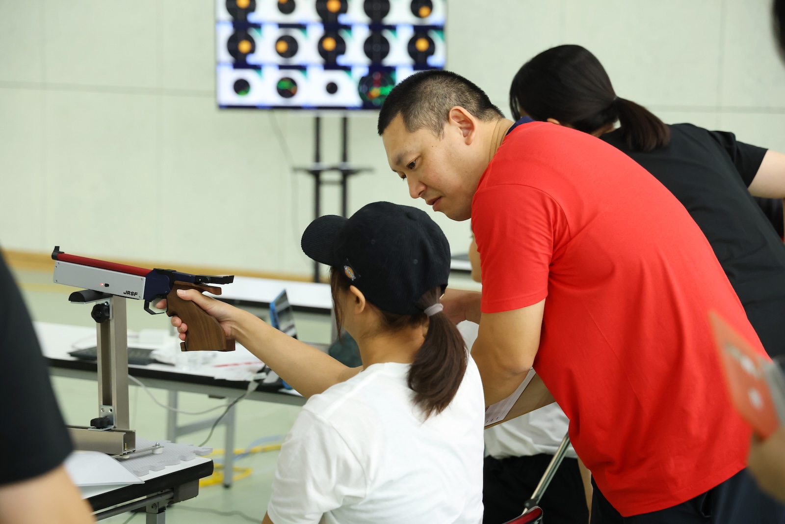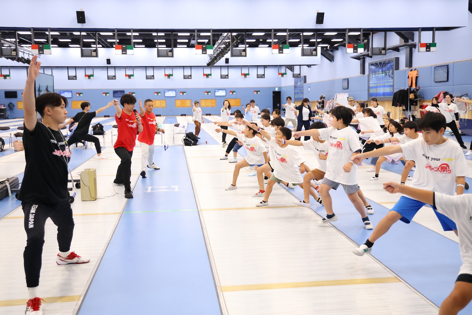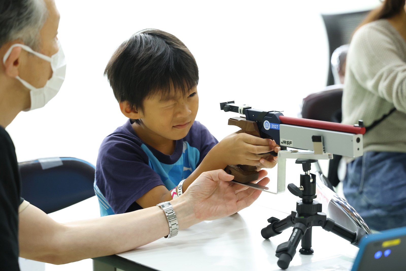 子どもたちがビームライフルやビームピストルに挑戦し、真剣な表情で的を狙いました。間近で代表選手の練習を見ることもでき、その迫力と集中力に触れながら、充実した時間を過ごすことができました。