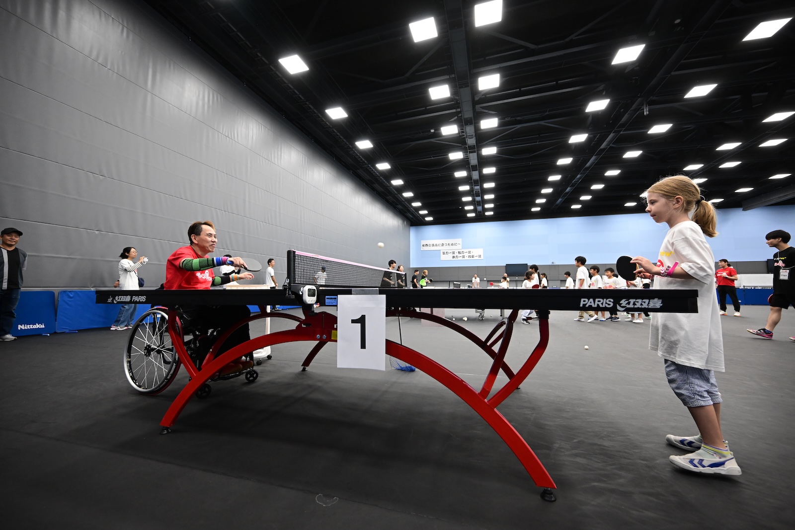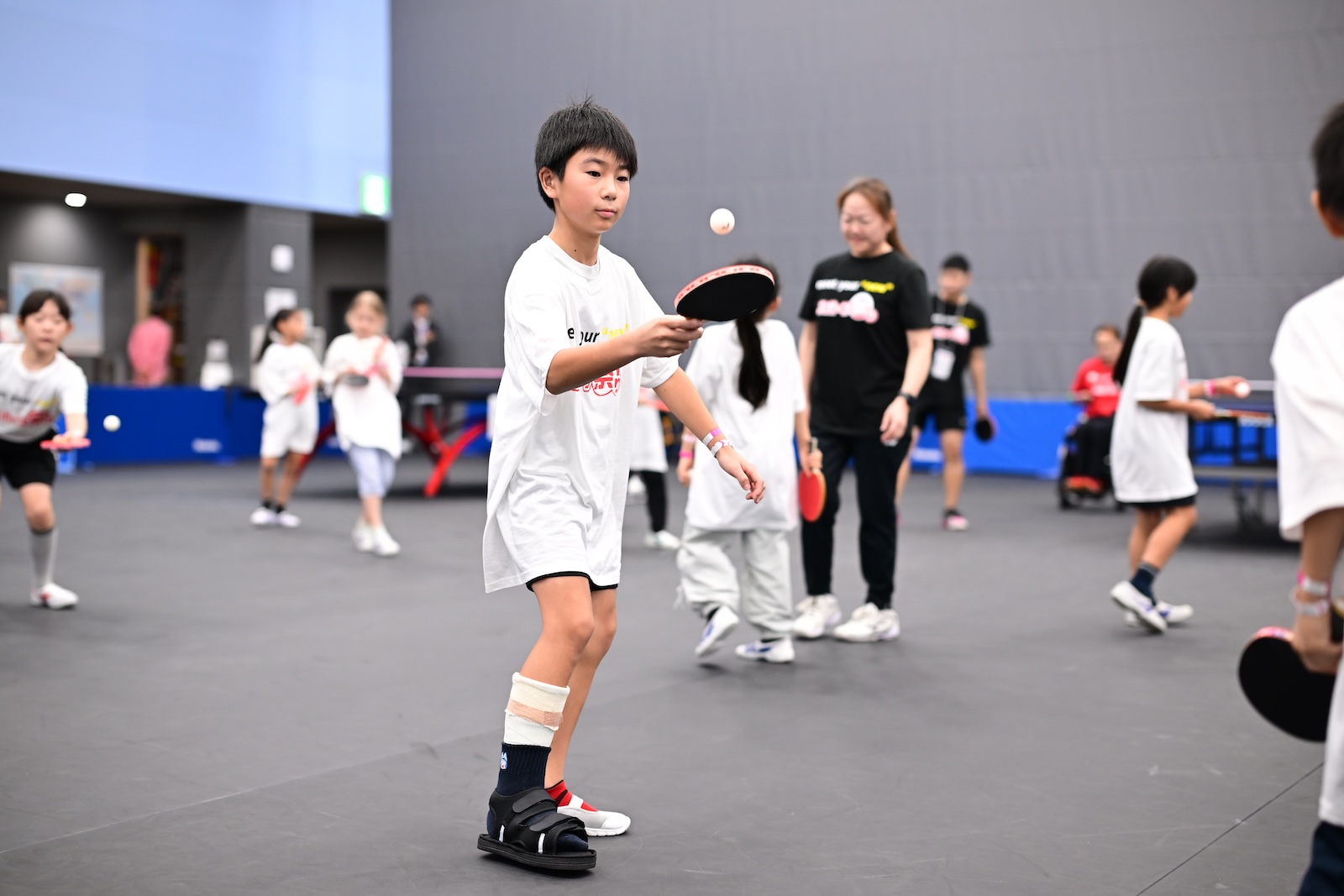 準備運動をしっかりおこなった後に、卓球ラケットの振り方の基本動作や車椅子の乗り方まで丁寧にレクチャーを実施。終盤は3つのグループに分かれて卓球コーチとの勝負がおこなわれました。子どもたちは協力し合いながら歓声を上げてボールを繋いでいて、笑顔と元気にあふれる時間となりました。