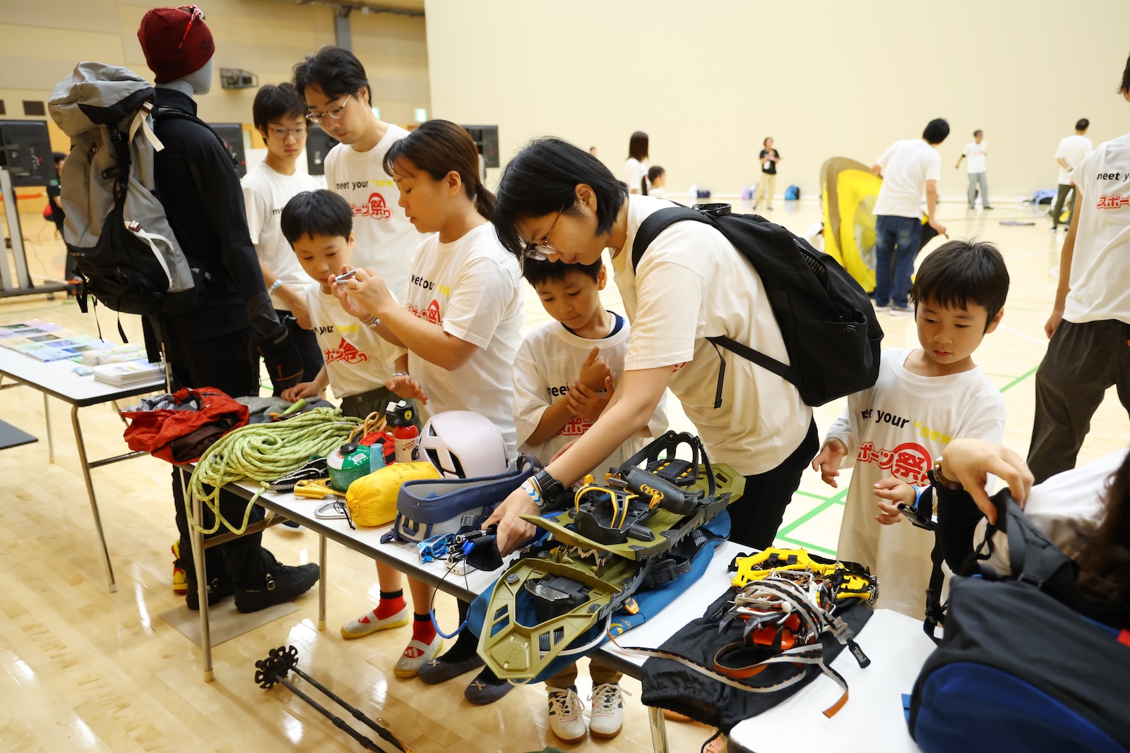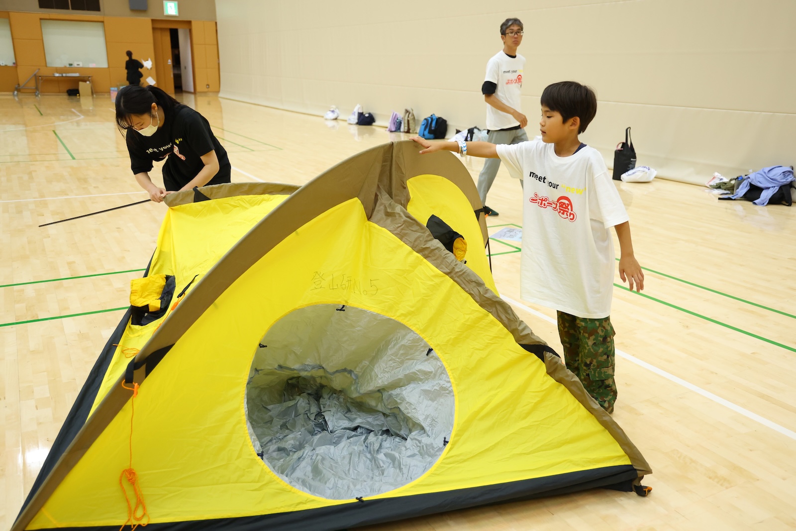 山岳用テントの設営やテント内での生活体験など多彩なプログラムを実施。登山用具展示もあり、子どもたちは自然の冒険を身近に感じながら、わくわくとした時間を楽しみました。