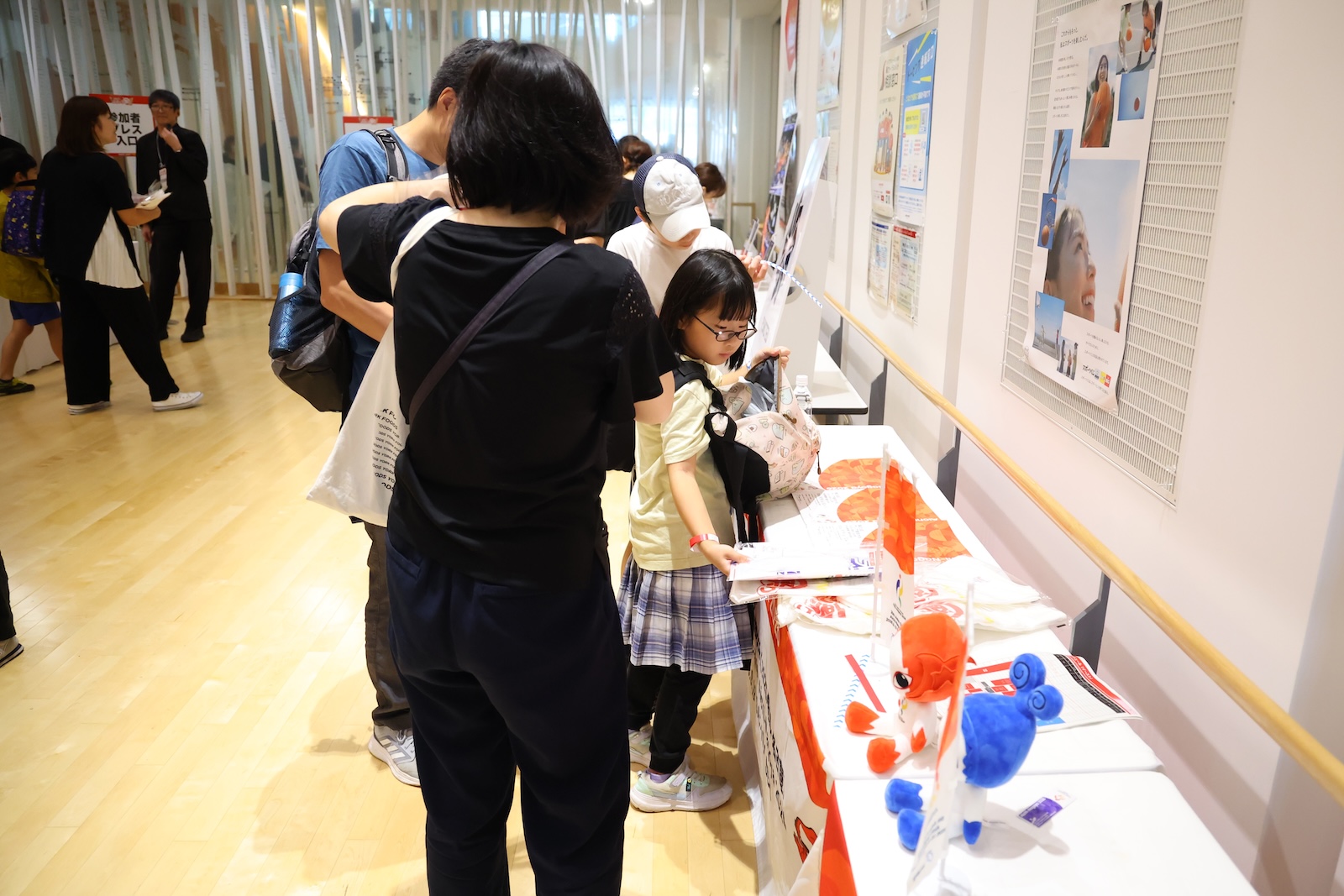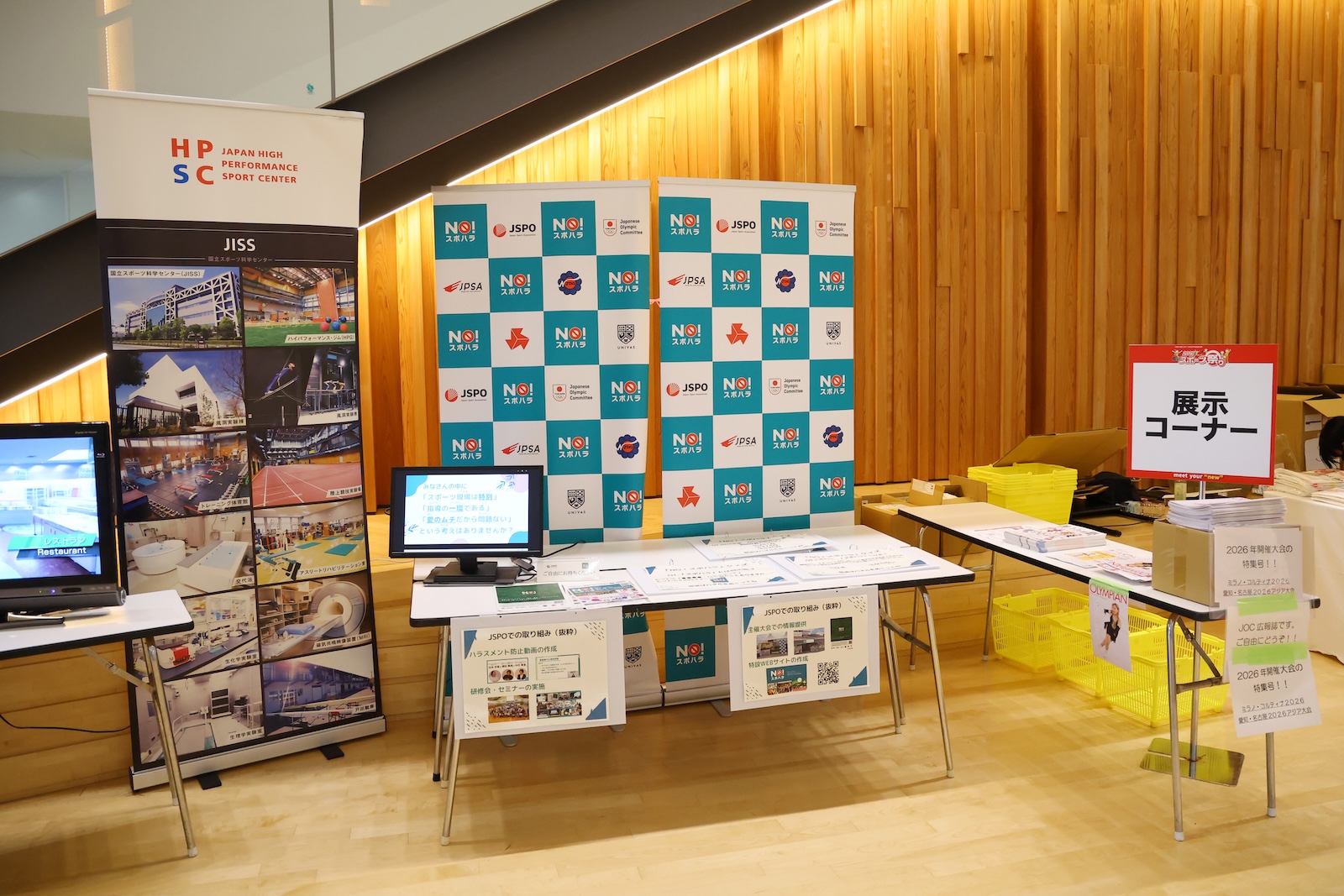 各ブースでは、スポーツ・ハラスメント防止を呼びかける展示(日本スポーツ協会)、HPSCの取組紹介(日本スポーツ振興センター)、あらゆるパラスポーツや競技用具展示(P.UNITED/パラスポーツ競技団体の共同プロジェクト)、2026年愛知・名古屋アジア競技大会のパンフレット配布(愛知・名古屋アジア競技大会組織委員会)など、多彩な内容に来場者は笑顔と好奇心で各ブースを巡りました。
